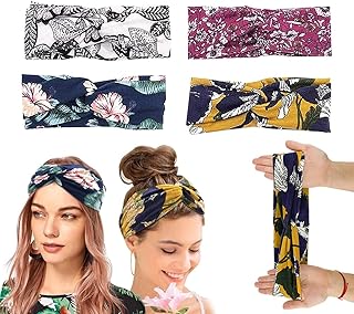 4 Stück Blumen Haarband Damen Sommer, XCOZU Boho Stirnband Damen Mädchen Turban Haarband Knoten, Kopfband Baumwolle Elastisches Haarbänder Bandana Stirnbänder Headband für Yoga Sport Fitness
