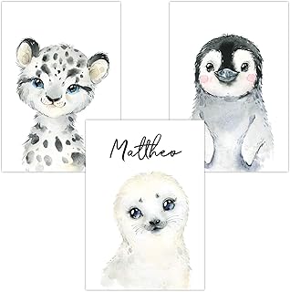 Wandbilder 3er Set personalisiert für Babyzimmer Deko | Kunstdruck DIN A4 | Dekoration Kinderzimmer Poster mit Namen (WP04 - 3er Set "Polar Baby Pinguin Seehund Schneeleopard")