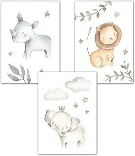 Lemmami Papeterie 3er Set Wandbilder Kinderzimmer Babyzimmer Poster Bilder DIN A4 Mädchen Jungen Deko Dekoration Dschungel Löwe Elefant Nashorn Safari (3er Bilder Set Wasserfarbe, Wanddeko)