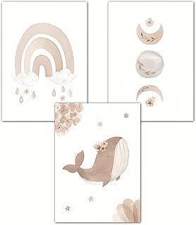 Lemmami Papeterie 3er Set Boho Wandbilder Kinderzimmer Babyzimmer Poster Bilder Mädchen Jungen (Regenbogen Wal Mond)
